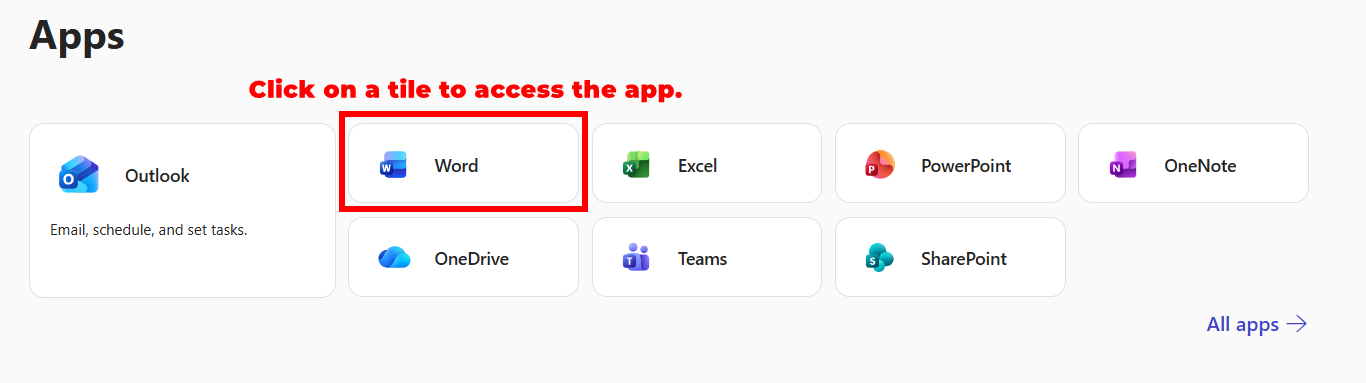 - Once logged in, you can select the Office app you wish to access by clicking on its tile in the Apps list.