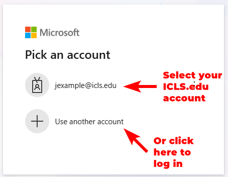 - If prompted, click on your ICLS.edu account or log in directly with your ICLS.edu Microsoft credentials.